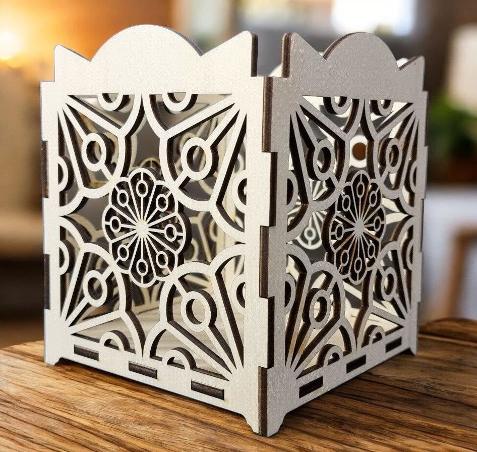 Diese dekorative Laterne aus Holz wird in liebevoller Handarbeit gefertigt und ist ein stilvoller Blickfang für jede Wohn- oder Tischdekoration. Die filigran gelaserten Motive sorgen – in Kombination mit einem Teelicht oder einer LED-Kerze – für stimmungsvolle Lichtspiele und eine warme, gemütliche Atmosphäre.
